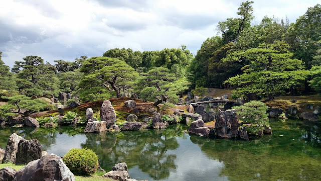 Nijō Castle in Kyoto, Japan, was built by a group of feudal lords for the Tokugawa shoguns (feudal military leaders). Completed in the 17th century, it combines outer and inner walls of stout fortification with the elegant architecture of the Edo period. The most expansive structure here is the Ninomaru Palace, a showplace and residence intended to flaunt the status and riches of the shoguns. To complement the sprawling residence, an extensive garden was laid out nearby, including the large pond we see here. Within it are three small islands and beyond stand groves of cherry and plum trees. - anon